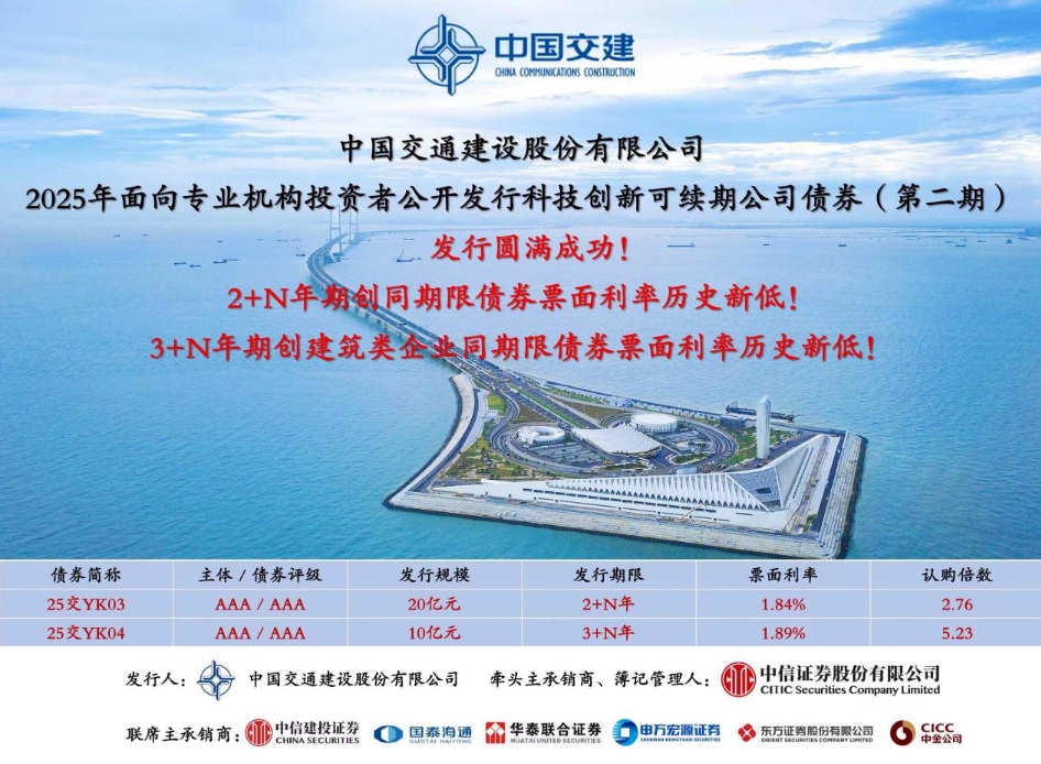 6月12日,中国交建在上海证券交易所成功簿记公司2025年面向专业机构投资者公开发行科技创新可续期公司债券(第二期),发行规模30亿元,募集的资金将重点用于科技创新平台建设、核心技术攻关等方面。
