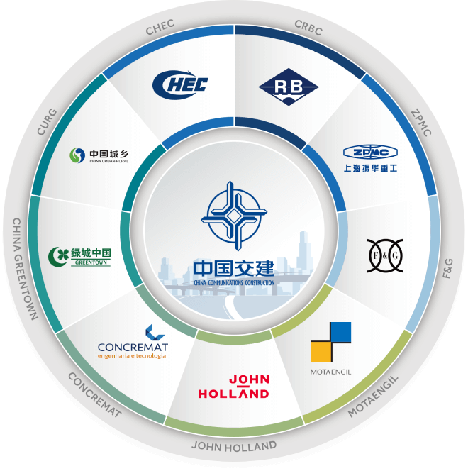 中国交建旗下拥有CHEC(中国港湾)、CRBC(中国路桥)、ZPMC(振华重工)、CURG(中国城乡)、绿城中国、美国F&G、澳大利亚 John Holland、巴西 Concremat、葡萄牙 MOTA ENGIL 等国内外知名品牌,在全球舞台与国际一流企业同台竞技。