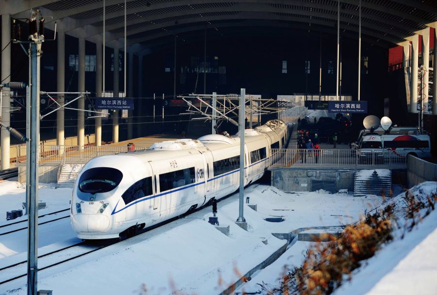 哈大高速铁路是世界上首条高纬度、高寒地区高速铁路,全长 921 千米,设计时速 350 千米 / 小时。