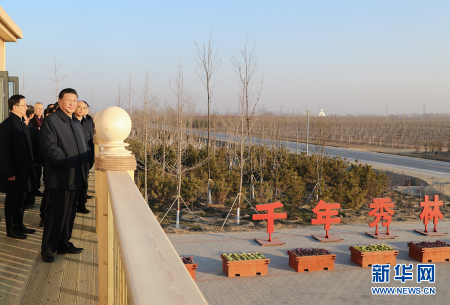 2019年1月16日下午,习近平总书记来到“千年秀林”大清河片林一区造林区域,乘车穿行林区察看林木长势,并在秀林驿站结合展板听取雄安新区生态建设总体情况和“千年秀林”区域植树造林情况介绍,登上二层平台远眺林区全貌,对运用科学方法植树造林、运用信息化手段管林护林的做法表示赞赏。他强调,先植绿、后建城,是雄安新区建设的一个新理念。良好生态环境是雄安新区的重要价值体现。“千年大计”就要从“千年秀林”开始,努力接续展开蓝绿交织、人与自然和谐相处的优美画卷。